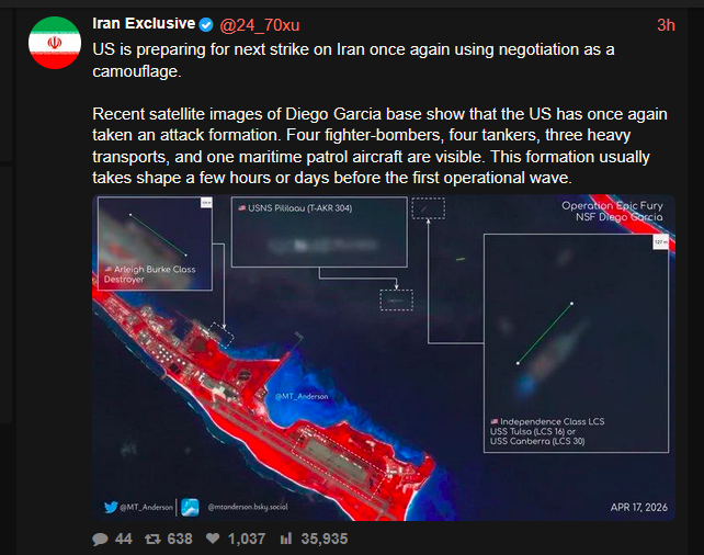 Prev: >>533386120Day: 11 of the 14-day ceasefire™ periodDay: 49 of the 1 day Special Military Operation to Decapitate Iran™Trump War Tantrum / Cope Counter: 30+ https://litter.catbox.moe/f0hmqh.txt▶RECENT:>NOTHING CHANGED. STRAIT IS CLOSED.>FRIDAY TruthSocial PUMPnDUMP. Contradictions GALORE.>Trumps statements are not confirmed by the opposing parties, both Israelis and Iranians.>A new round of US–Iran talks is expected to take place in Islamabad, Pakistan, on Monday, APR 20th, according to CNN, citing Iranian officials.>Israelis are not happy about the rumors of peace and started complaining again.>Intense Israeli artillery shelling of Khiam, Debbine and southeast Lebanon, less than 30 minutes into the ceasefire.>Lebanon ceasefire went into effect, APR 16th 21:00 UTC.>US & Iran ceasefire is set to expire on April 22.▶WARNING:>Do not trust any "happenings" without link/proof>Uкraine / Яussia discussions belong in uнg or cнug▶Thread Theme:https://www.youtube.com/watch?v=mgxRfGCPV6g▶Oil:>https://oilprice.com/oil-price-charts/▶Kino:https://files.catbox.moe/dqr3fl.mp4https://files.catbox.moe/jg9rat.mp4https://files.catbox.moe/fx86zj.mp4https://files.catbox.moe/cbd7ug.mp4https://files.catbox.moe/2hwzcx.mp4https://files.catbox.moe/smmsfw.mp4https://files.catbox.moe/x0fbgv.mp4https://files.catbox.moe/20lpu8.mp4https://files.catbox.moe/86yxn2.mp4▶Live-streams:https://www.youtube.com/watch?v=4E-iFtUM2kkhttps://www.youtube.com/watch?v=TdcrT5OcS9chttps://www.youtube.com/watch?v=53G-Oy4r6M4▶Hormuz Strait Traffic:https://hormuztracking.com/▶Telegram Channelshttps://rentry.org/tgnews▶Israel Rocket Alertshttps://www.tzevaadom.co.il/en/▶Air Traffichttps://www.flightradar24.com/https://flightaware.com/livehttps://globe.adsbexchange.com/▶Maritime Traffichttps://www.marinetraffic.com/https://www.vesselfinder.com/