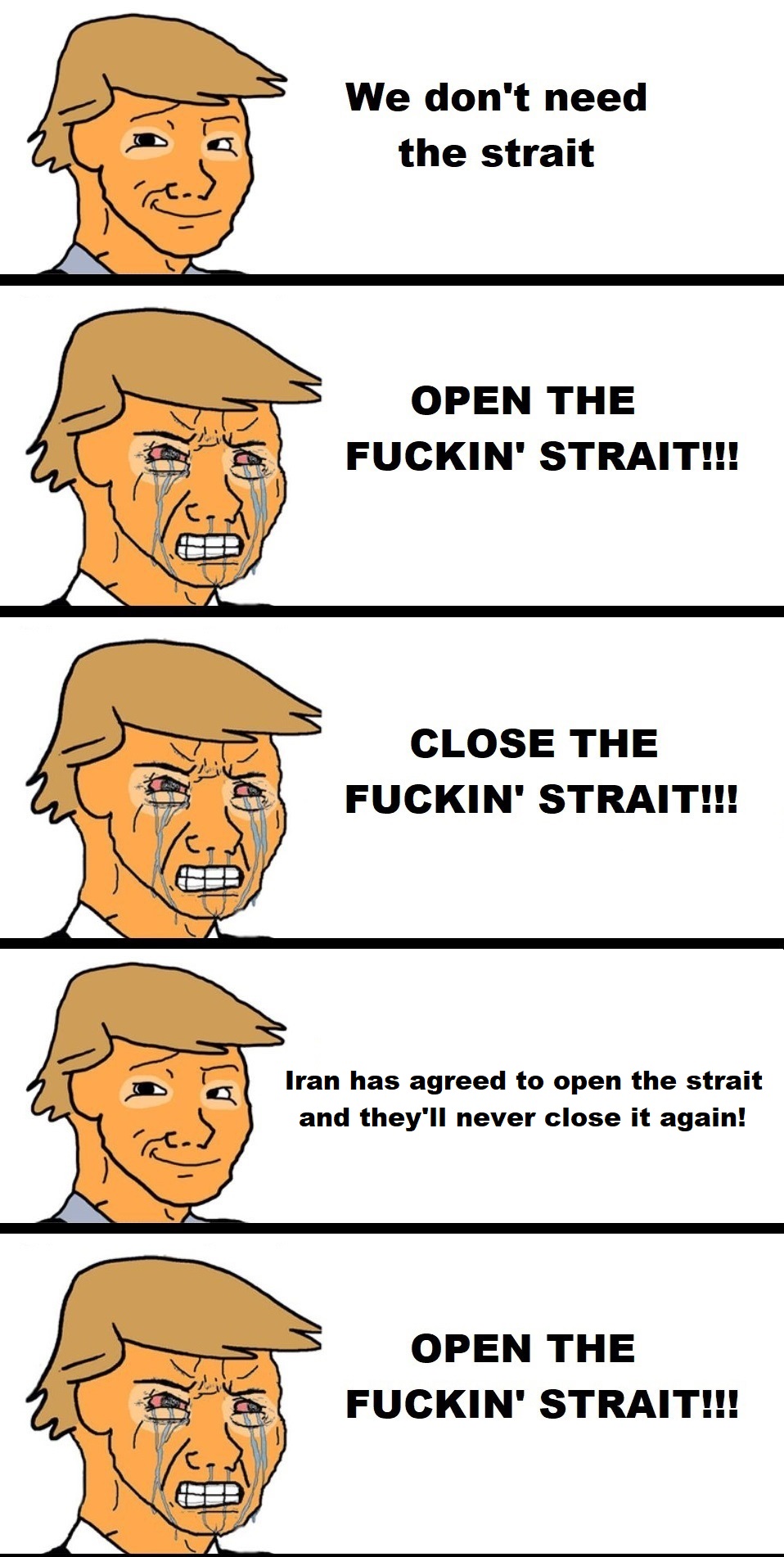 >>533394816Yeah i don't get it myself. The speedrun on the US's usual backstab doesn't get the oil out of the strait and Iran is basically turtling, daring the US to do something about it.