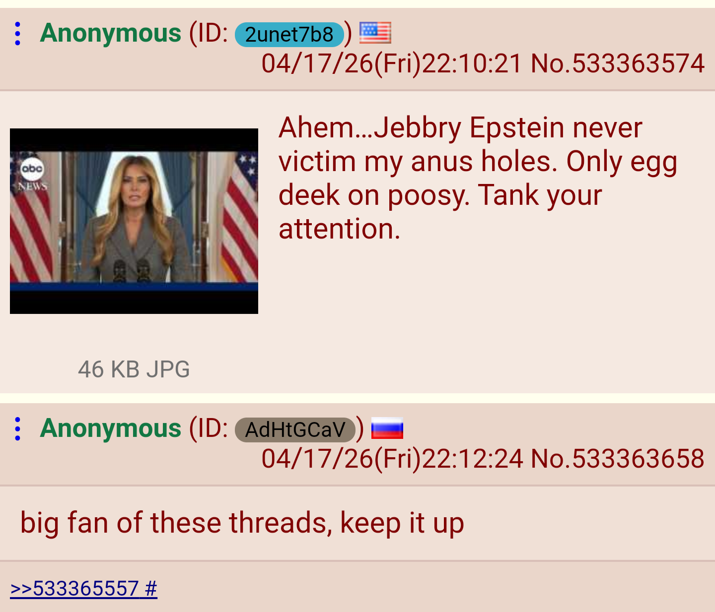 >>533395836Yeah I've always wondered why, in posts like this, let's say you have 80 replies. Well 40 of them are the "mandatory" replies that are there EVERY post. I'm always wondering why the fuck that happens lol. I've always assumed the answer was something sketchy. I mean we have 100% verified proof that Epstein was at least involved with the founder of 4chan in some capacity. What is this place? What is its purpose? Why are so many news-worthy lunatics active on it before they go do some crazy shit? Why are interesting threads immediately locked down and replies disallowed? Someone with answers please tell me and then don't stand on any balconies for a while