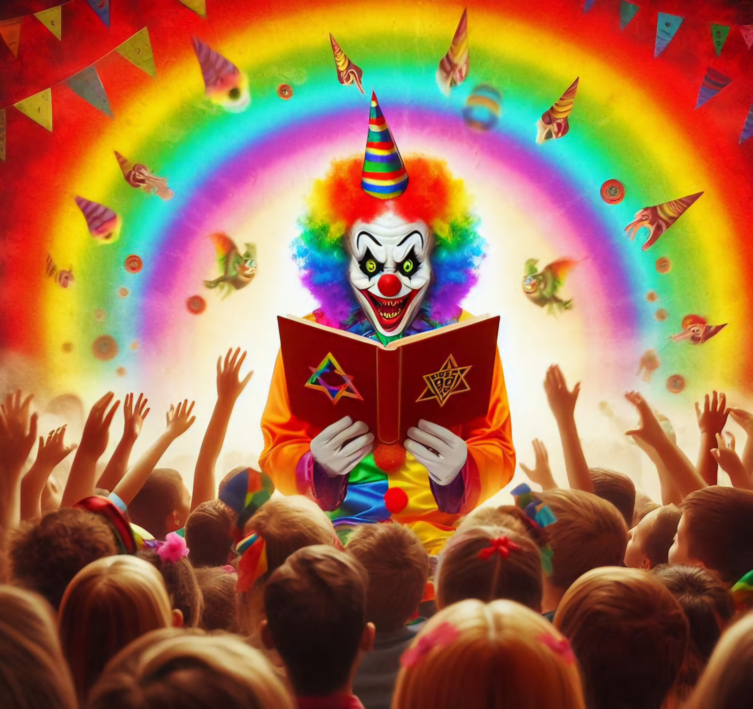 >>533415080prompt was just "evil clown reading to children" it put the repham stars on it's own kek