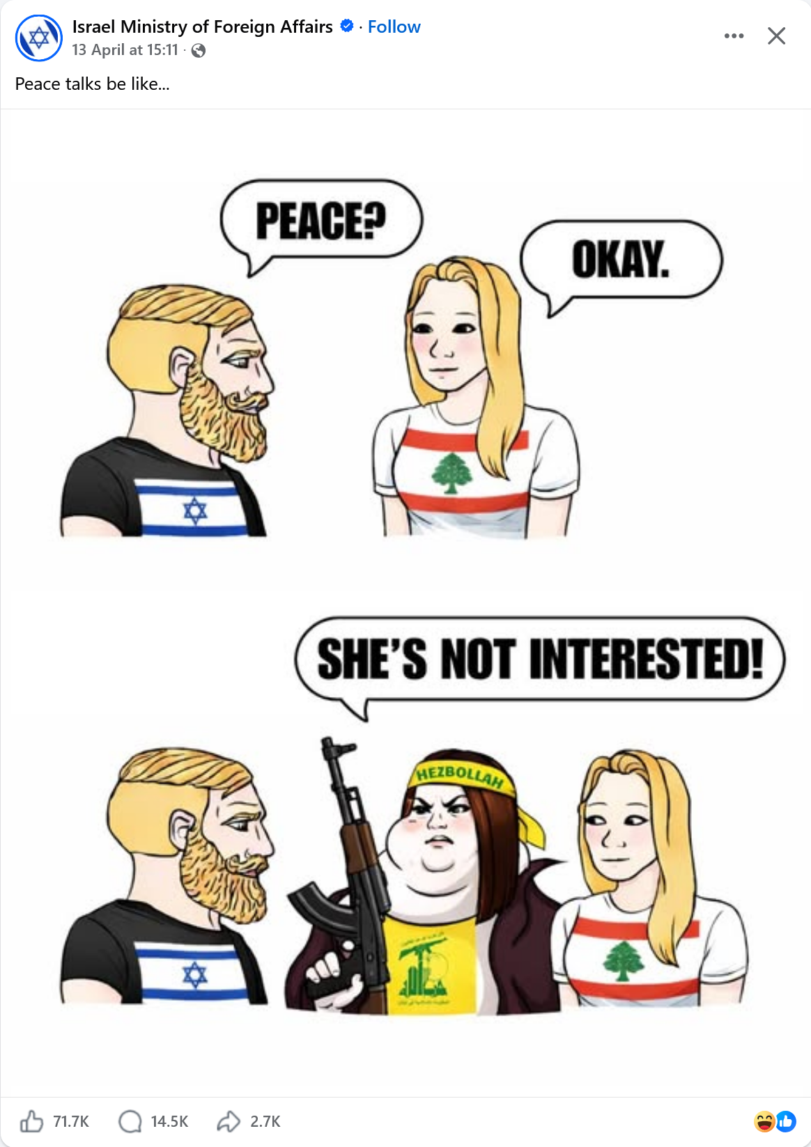 This is just a meme stolen from us with a bit of switcheroo. Israel doesn't ask for peace or abide by its terms ever so it's a stupid and jewish and gay and retarded attempt at a meme.