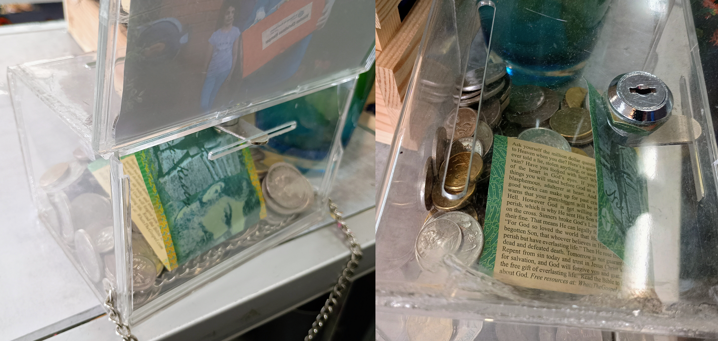 Saw someone did this with a donation box at the used good store I worked at a few years agoAnd it was an openly Christian charity, so preaching to the choir anyway