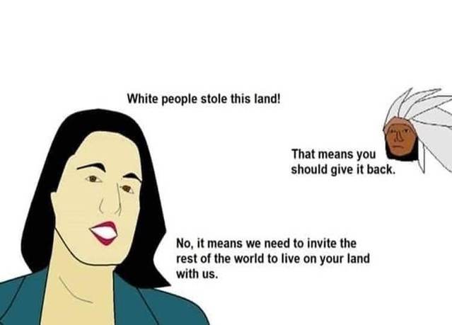 >>533401879Who has the smuggie meme for this argument?>america is stolen land>therefore you should import millions more people instead of giving it back to the natives