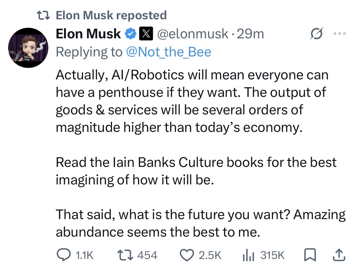 Reminder that this is the guy developing brain computers, if he's making utopian predictions I think it's a lot more likely they're hoping that tech somehow magically gets to the point where you get synthetic luxury in a fake world. Less Star Trek, more Black Mirror.