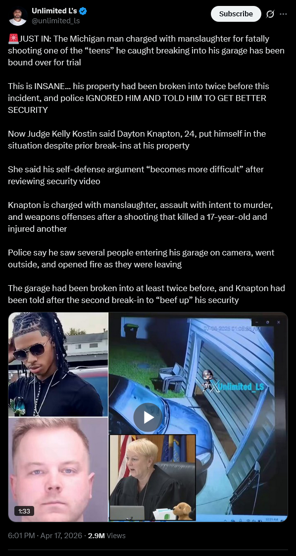 if you break into a home in a red state with no gun laws in 20 fucking 26, where they have Home Intruder Killer 3000 ARs on red-tag sales at Walmart, you automatically forfeit your life, and no one can save you from the aftermath of what may come.
