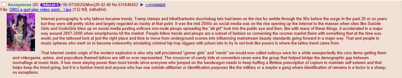 >>533408684>Twitter is now calling tattoos goybrandingIt was goybranding 15 years ago when every skinny art school queer started covering themselves head to toe in tattoos to cope with having 0 masculinity and being totally and completely unintimidating. The problem now is that every effeminate dweeb has tattoos, so they no longer have the same effect, it's just goybranding now.