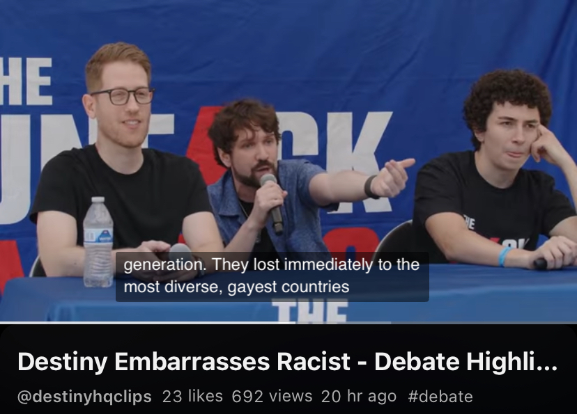 >https://m.youtube.com/shorts/jh276CfVL44>I will debate anyone and suck their cocks- Destiny the Sex Pestiny.