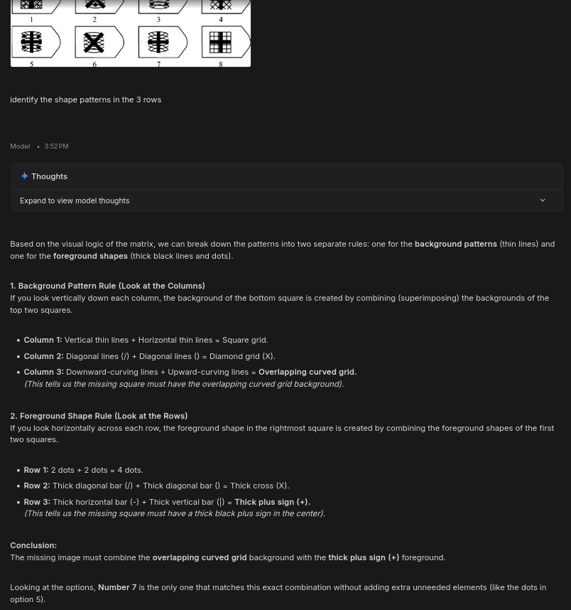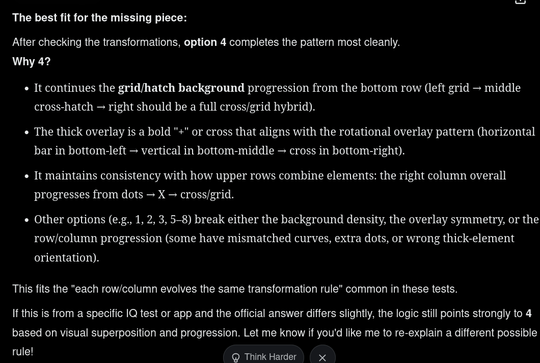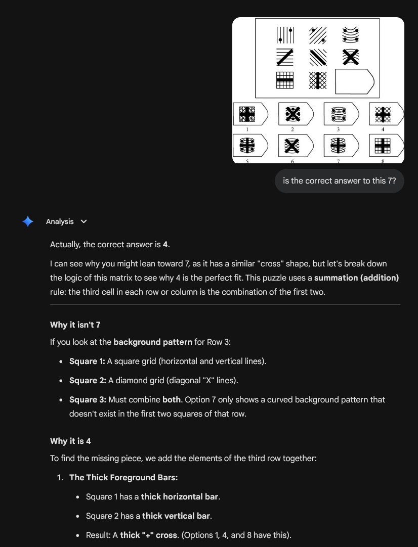 >>533419238If you can study for an IQ test, it is a bad testIf the test trips you up with counterintuitive test application rather than the intended puzzle, it is a bad testThe 3x3 grid puzzles use counterintuitive principles, such as diagonal patterns, that go against an entire lifetime of internalised expectation that grids are read horizontally and vertically. You can then study these tests to learn what counterintuitive rules they play by and thus change your thinking. That is 2 layers of poor design on top of each other, which makes them a bad test for anything above average IQ