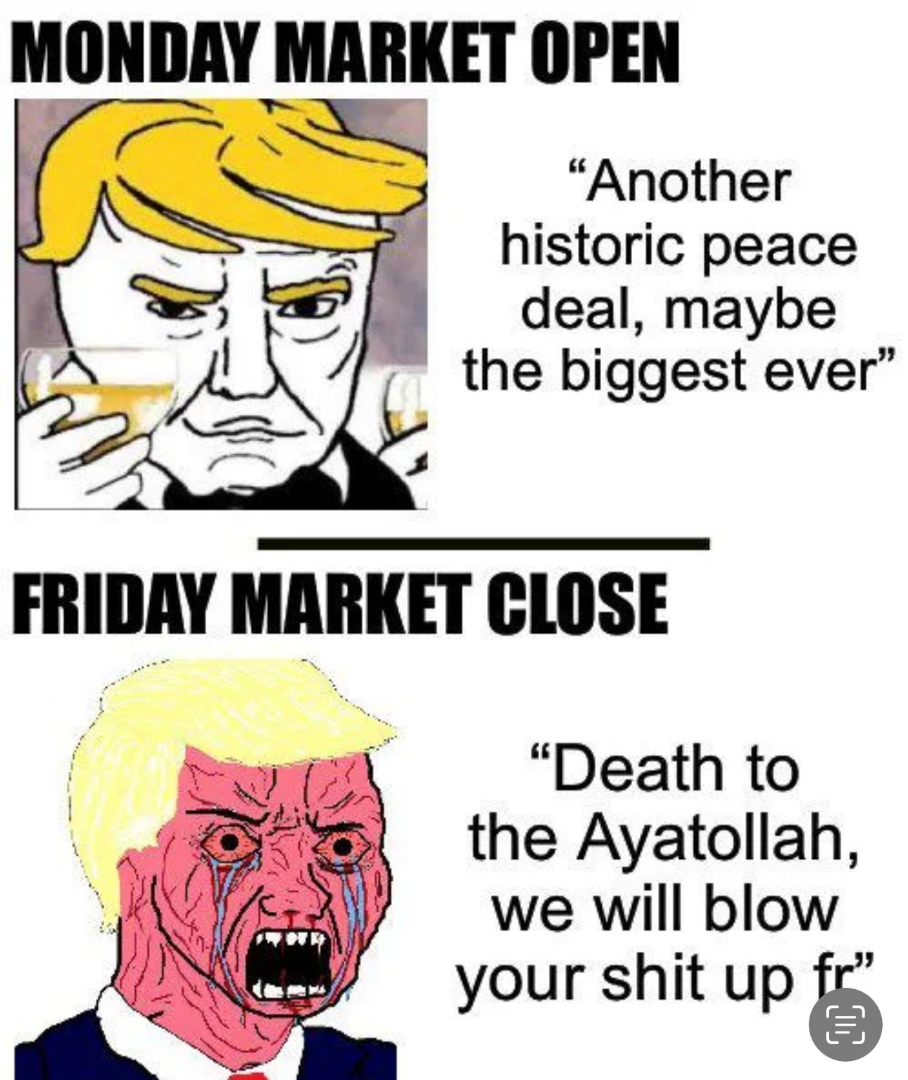 >>Iran calls out king miggers bluff>>king migger threatens and sets up yet another deadline for iran >>last minute king migger will TACO and say some deal is magically made and we won for the 50th time and the strait is totally open for everyone Rinse and repeat
