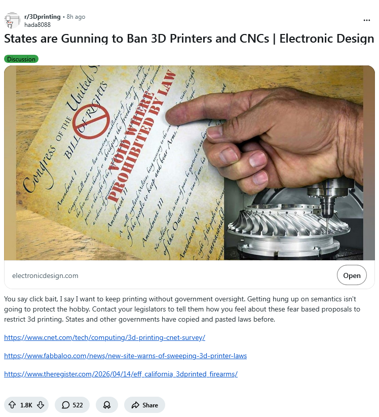 A bill was passed in California that requires any new 3d printer sold after the start of next year to have ghost gun prevention algorithm in it.