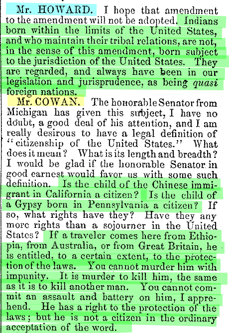 Pic related is Senator Howard describing why the Native Americans were excluded from protection under the Citizenship Clause of the 14th amendment despite them being born on US soil.
