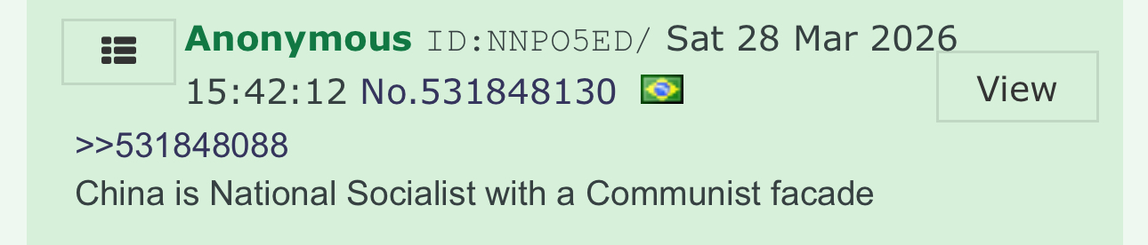 >>533419404>communist or national socialist?both sucks Sadly, the monkeys here idolize China, believing they're living through an ideological war.Deep down, I feel sorry for these people.