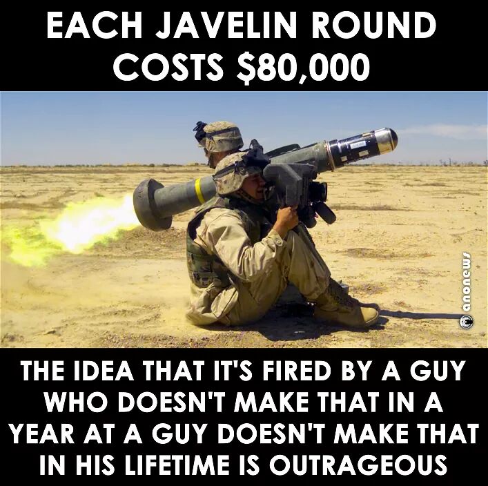>>533422203As of 2023-2025, a single FGM-148 Javelin missile round costs approximately $197,000 to over $240,000