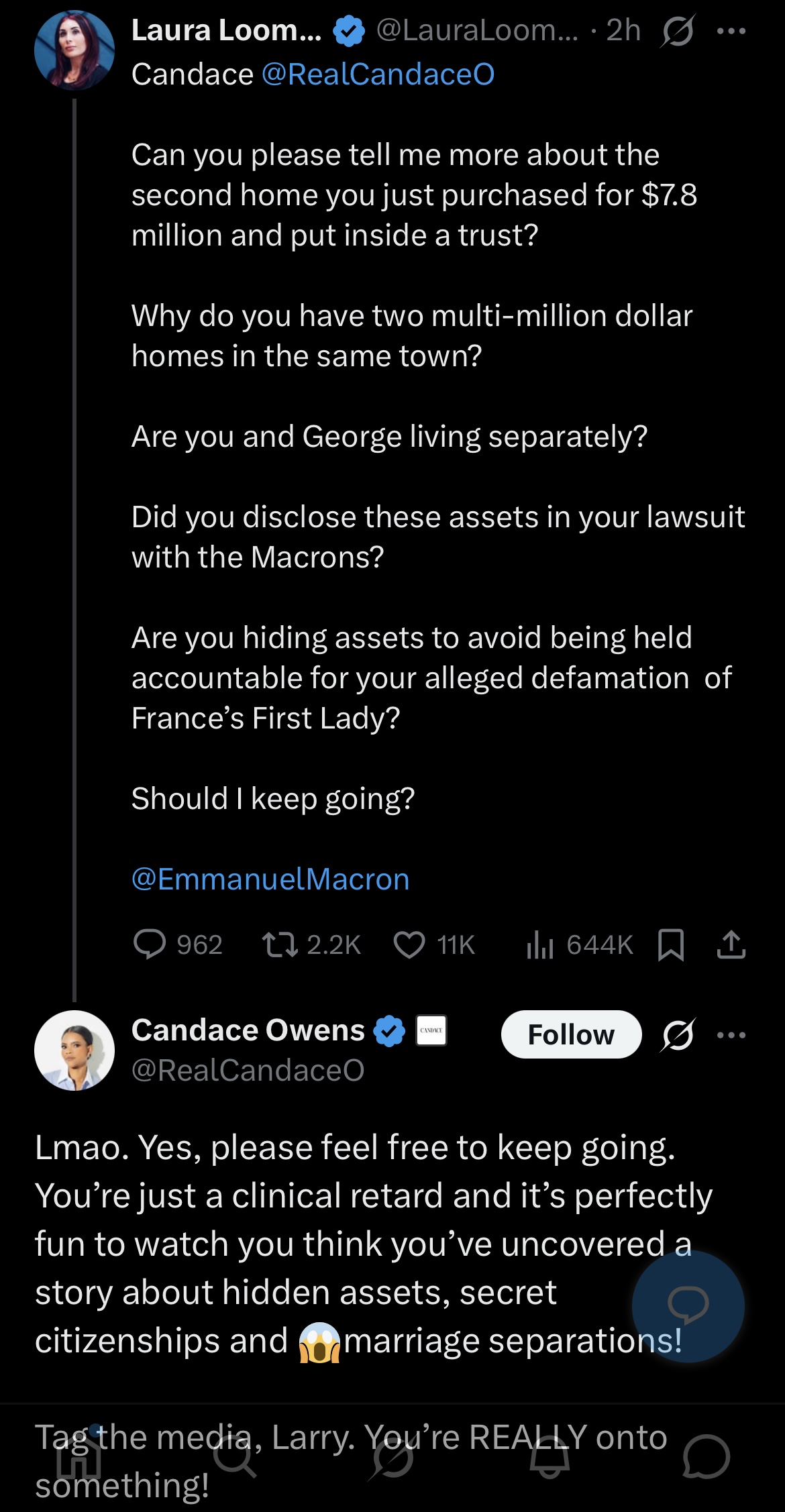 this is very JewishLarry Loomer is going after Candace going after Macron not because LL like Macron (who just shit on Israel's war on Iran) butt because Candace tells the truth about The Jews when it cums up.BTW, Candace only latched on to the Macron tranny story because FELLOW JOURNALISTS were been attacked by the French govt for telling the truth.