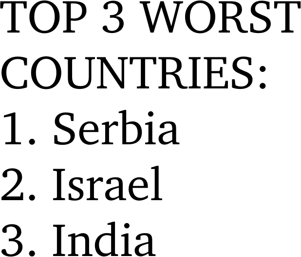 That's not really fair.Serbia and israel are normal countries.India is the one where you want to kill yourself. There is constantly garbage fume in the air.