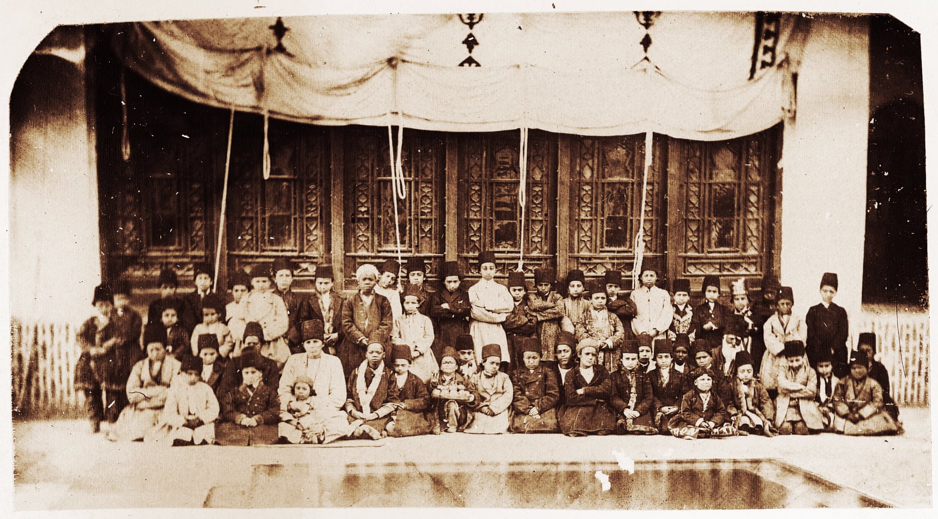>>533444099eunuchs of the Qajar royal harem in Iran who were made out of black slaves and white slaves>Nasser al-Din Shah had a special interest in taking photos of his own slaves inside the harem. In this photo, 53 eunuch slaves of different ethnic backgrounds in their early childhood, had probably been recently sent from abroad to the local southern markets, and to the king’s harem. Among them four African boys (qolam bachehha), inside Nasser al-Din Shah’s harem, Golestan Palace, Tehran. Date unknown. Photograph: Central Library, University of Tehran, Tehran, Iran