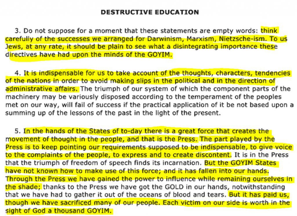 'The Protocols of the Learned Elders of Zion' suggests that manipulating the press and media is a primary way to control society by shaping public opinion, silencing dissent, and spreading propaganda.This is done through owning or influencing news media, publishers, radio, television, movies, and now social media influencers and social media platforms, to control the flow of information.This control is used to shape cultural norms and suppress dissent by only allowing approved messages, and by distracting people from important issues with sensationalism, gossip, and trivial entertainment.
