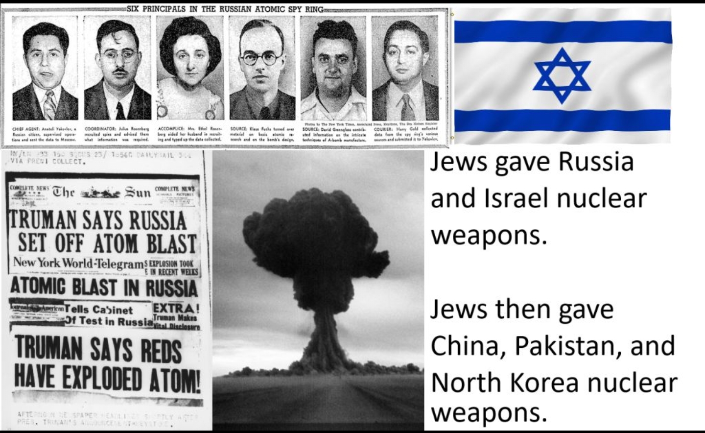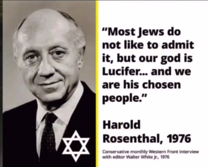 >>533440661...>Views on Christianity and Jesus:Rosenthal rejects Jesus as a spiritual leader or Jew, calling him an "imposter" crucified for offering a kingdom Jews couldn't control. Christianity is dismissed as based on lies, with the resurrection labeled "crap." He claims Jews propagate their teachings in Christian seminaries via rabbi-professors, leading Gentiles to misinterpret the Bible "through Jewish spectacles.">Judaism and Lucifer:In a notorious quote, Rosenthal states, "Most Jews do not like to admit it, but our god is Lucifer," positioning Jews as his chosen people. Judaism is described as a worldly culture focused on material gain, not morality or afterlife, with the Talmud providing rules to exploit Gentiles. He lists "five major falsehoods" Jews promote: that they are God's chosen/Israelites, Jesus was Jewish, six million died in the Holocaust, all races are equal, and Jews are just a religion (not a race).>Jewish Unity and Parasitism:Jews are portrayed as racially unified, spiritually separate from host nations, never creating but confiscating wealth. Historical persecutions are claimed to be strategic, with fake conversions buying time, and events like WWII instigated for propaganda.>Antisemitism and Deception:"Antisemitism" is called a smear invented by Jews to silence critics. Name changes help Jews blend in, especially in government.>Race and Minorities:Blacks are promoted in media and used as tools for Jewish purposes, with plans to encourage interracial mixing to weaken Gentiles. Conversions like Sammy Davis Jr.'s are mocked as superficial.>Intelligence and Dominance:Jews are claimed to be the smartest race, dominating fields like medicine (e.g., 10,000 of 12,000 U.S. doctors) due to family standards. They create societal "confusion" (Babylon's meaning) and predict controlling U.S. foreign affairs as a "supergovernment."
