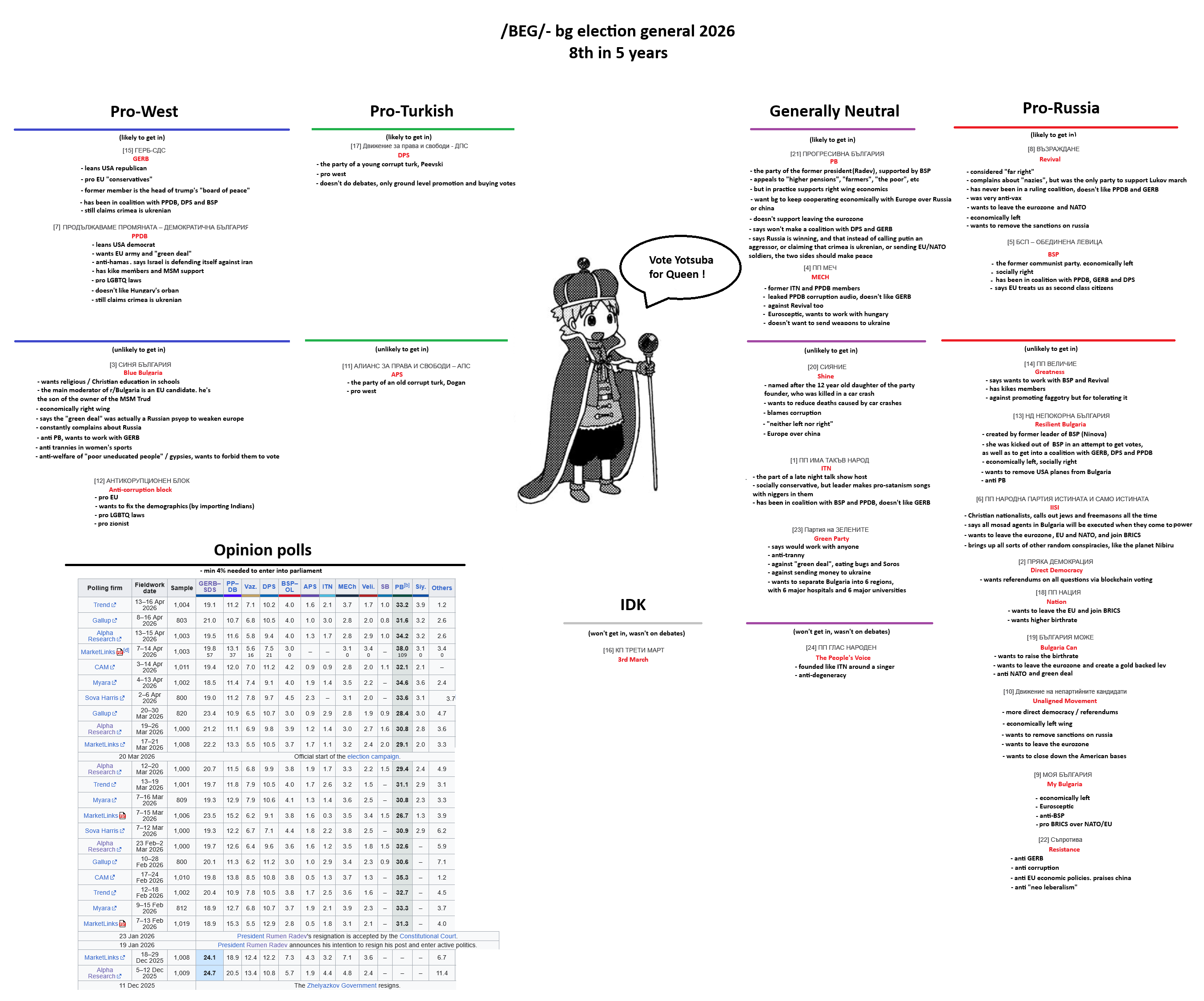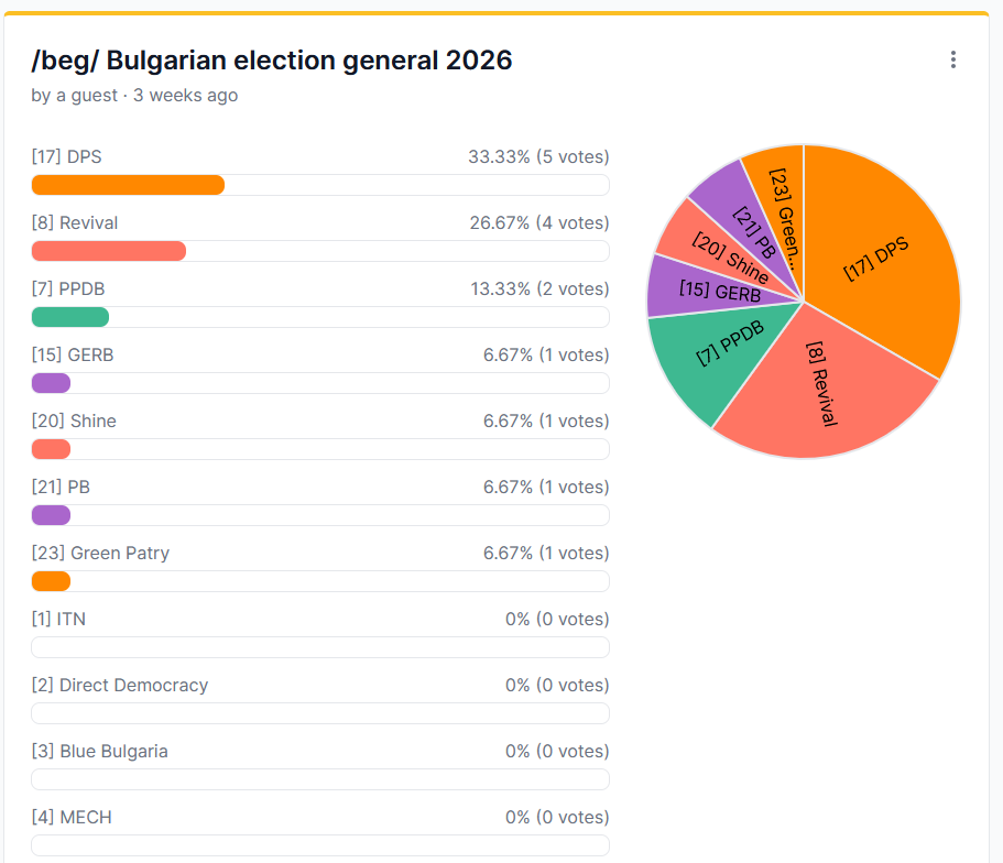 bg election Q&A>whenTODAY (19.04) from 07:00 to 20:00>whatBG parliament>where- you can find which location you're registered to here: https://www.grao.bg/elections/Secure/Public/EgnSearch.cshtml - and if you're diaspora here: https://glasuvam.org/parl2604r>do i need to bring anything- your national ID (not expired. passports and drivers license are not accepted)>are there new voting machines- nope>how do i vote with a computer- basic info: https://www.youtube.com/watch?v=O4xp9rNyBDk- for paper: https://www.youtube.com/watch?v=Qn7TJpnwKwA- interactive demo (remember it's chip IN and UP): https://www.cik.bg/suemg_02.04.2023/>is the vote public or private- private. on your way out aunties might ask you who you voted for so they can report results early, you can answer if you want>where can i follow live exit polls early- dnevnik youtube channel- standart news- blitz bg>official exit polls @19:50- bnt news>where can i follow the official results- https://results.cik.bg/>when will the official results be counted- probably tomorrow evening>who should i vote for (quizzes are old, so not all parties are in there)- quiz1: https://balgariya.isidewith.com/en/- quiz2: https://euandi.eu/survey/european-elections.html- quiz3: https://poltest.strazha.bg/parliament-02-10-2022- 4chan poll: https://strawpoll.com/GJn44R0LYnz>who are the preferential candidates- https://www.cik.bg/bg/ns19.04.2026/listi>"there is no political solution"- https://rentry.org/bg_revolutionaries>old leaks and news (that i can't be bothered to update)- corruption and tyranny: https://rentry.org/beg2024_laundry- the absolute state of bulgaria: https://rentry.org/beg2024_news- QRD and history: https://rentry.org/beg2024_qrd- non-politics here: >>>/int/balk/the buying and selling of (You)s in not a crimeold >>533429001
