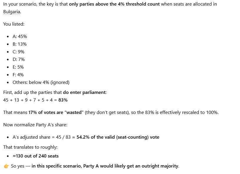Preliminary results:>Progressive Party 35% - generic slopulism, literally no clue what the party is about, the new thing>GERB 18% - conservatism + construction sector and general big biz corruption, the old thing>PP-DB 12% - the liberals who are ashamed of calling themselves liberals>DPS 7.5% - the ethnic minority party that threw out its ethic minorities and is ran by a mobster now>BSP 6% - the renamed Communist Party trying to get a younger face, pensioneer party>Revival 5% - the schizo nationalist party, basically a protest movement trying to not have a government everUNDER 4% YOU DONT GET ANY PARLAIMENT SEATS>APS 3% - the remnants of the ethnic party, where all the ethnics are left>Velichie 2.5% - a pyramid scheme cult of personality party>Mech 2.5% - a guy who joined and left 3 other parties, and made his own party with his friends>Siyanie 2.5% - a parent of a girl who died in a car accident is trying to make driving harder for everyone, and this is the party>2.6% said they will spoil their ballots and vote for nobody