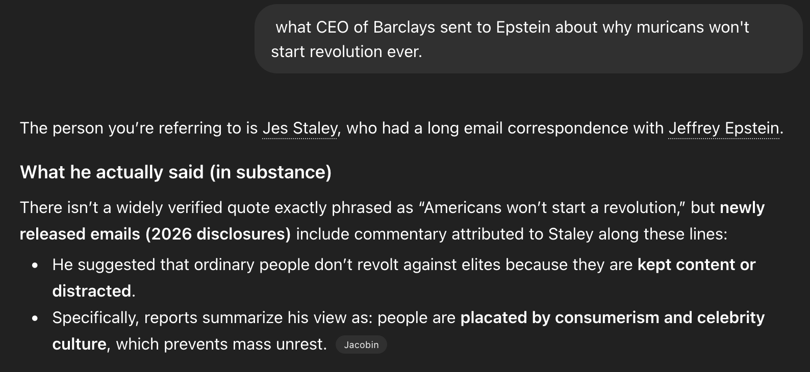 Post what CEO of Barclays sent to Epstein about why muricans won't start revolution ever. It was quite humiliating and cope worthy.