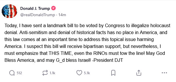 >This time I am sending a landmark bill to be voted by Congress to illegalize non-Zionist narratives. And remember my fellow Americans: you voted for this.