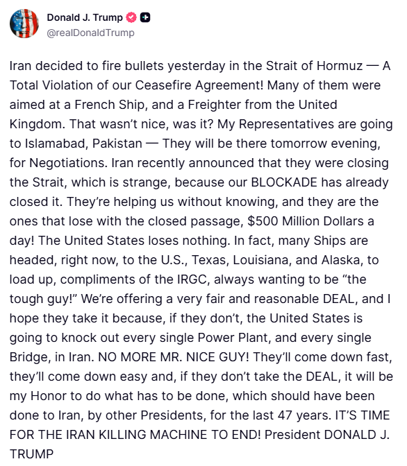 Iran still won't open the strait and trump is powerless to make them without a full land invasion, they hold all the cards and trump is panicking so telling them he has already closed the strait and therefore they are helping him, claiming the US now sells more oil and finally threatening civilian infrastructure and murder if they don't take the deal he has dreamed up to try to save face. Basically just throwing anything at the wall to see what sticks.