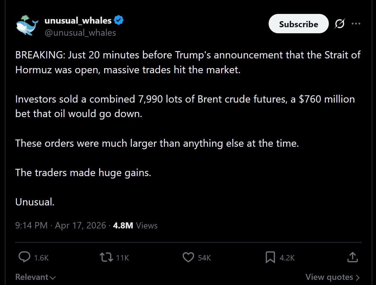 Unfortunately for him with Iran now blocking traffic again the insider traders have bet the wrong way.