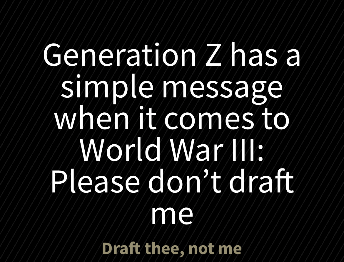 >>533447669>fight in WWIII>fight for Israel’s border on the other side of the planet in a Middle East shit holeWhen you say what you really mean Zoomers not wanting to be drafted makes perfect sense