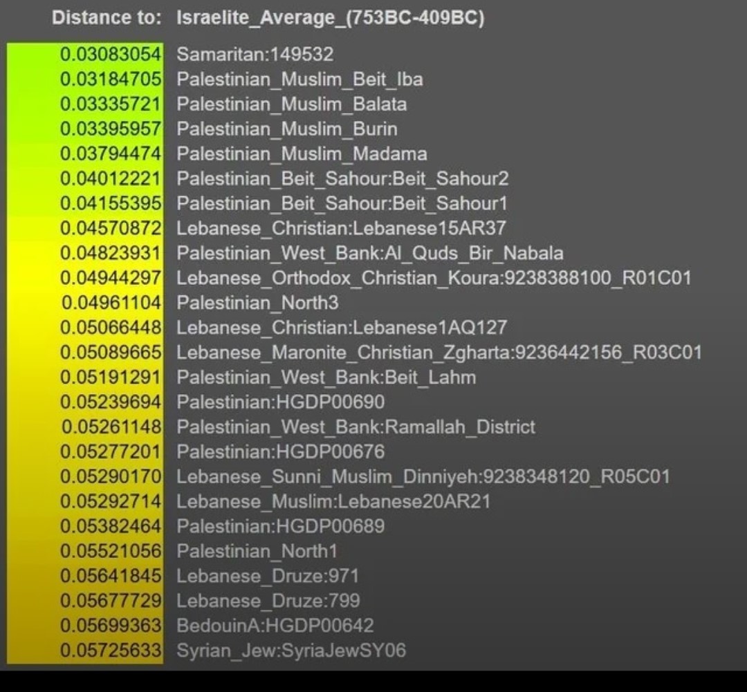 >Palestinians, among other Levantine groups, were found to derive 81–87% of their ancestry from Bronze age Levantines, relating to Canaanites as well as Kura–Araxes culture impact from before 2400 BCE (4400 years before present); 8–12% from an East African source and 5–10% from Bronze age Europeans. Results show that a significant European component was added to the region since the Bronze Age (on average ~8.7%), seemingly related to the Sea Peoples, excluding Ashkenazi and Moroccan Jews who harbour ~ 41% and 31% European-related ancestry respectively, both populations having a history in Europe.[33]:1146–1157