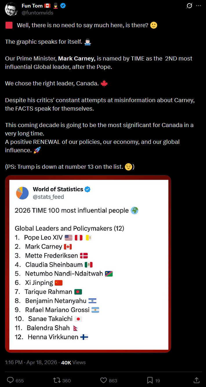>>533466840>Carney never heard from except when he's getting embarrassed or btfo or embarrassingly btfo>#2 compared to Trump #13I can't imagine the mental gymnastics required to say that the man who is included by name or reference in (probably) 80% of the world's posts on a daily basis is less influential than .. checks notes .. Henna Virkkunen.