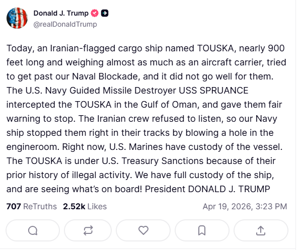 >tweetToday, an Iranian-flagged cargo ship named TOUSKA, nearly 900 feet long and weighing almost as much as an aircraft carrier, tried to get past our Naval Blockade, and it did not go well for them. The U.S. Navy Guided Missile Destroyer USS SPRUANCE intercepted the TOUSKA in the Gulf of Oman, and gave them fair warning to stop. The Iranian crew refused to listen, so our Navy ship stopped them right in their tracks by blowing a hole in the engineroom. Right now, U.S. Marines have custody of the vessel. The TOUSKA is under U.S. Treasury Sanctions because of their prior history of illegal activity. We have full custody of the ship, and are seeing what’s on board! President DONALD J. TRUMP
