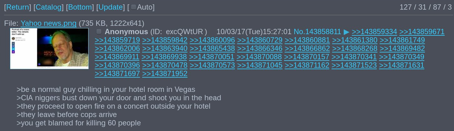 >>533467081>Wasn't following the platform at the time.Anons tied the tail number of his plane to a CIA shell company exposed in previous leaks, then I watched real time as all info on the plane disappeared from government websites, then when an anon pointed out there was a mirror site not ran by the government, you could find the info there for another 10-15 minutes before it disappeared. H-dawg was tweeting about bumpstocks while the bodies were still warm. There may or may not have been an arms deal, wouldn't be surprised if that's just another layer of glownigger disinfo, and I wouldn't be at all surprised if Paddock was already a corpse by the time the shooting happened, left there to be a patsy. He was undeniably a CIA asset at the least.