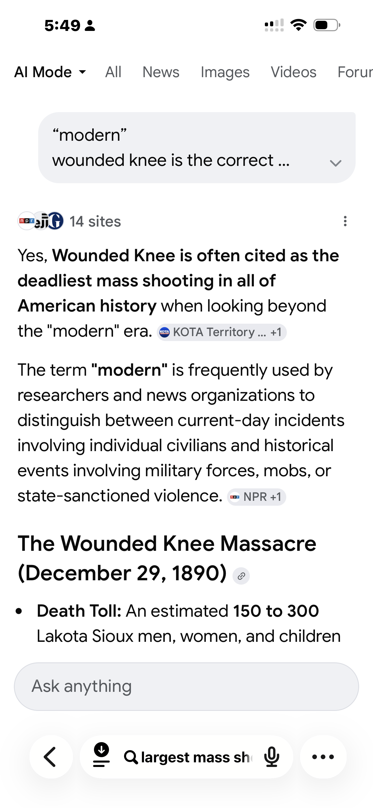 >>533467081*Modern US history. The deadliest mass shooting in all of US history is still wounded knee