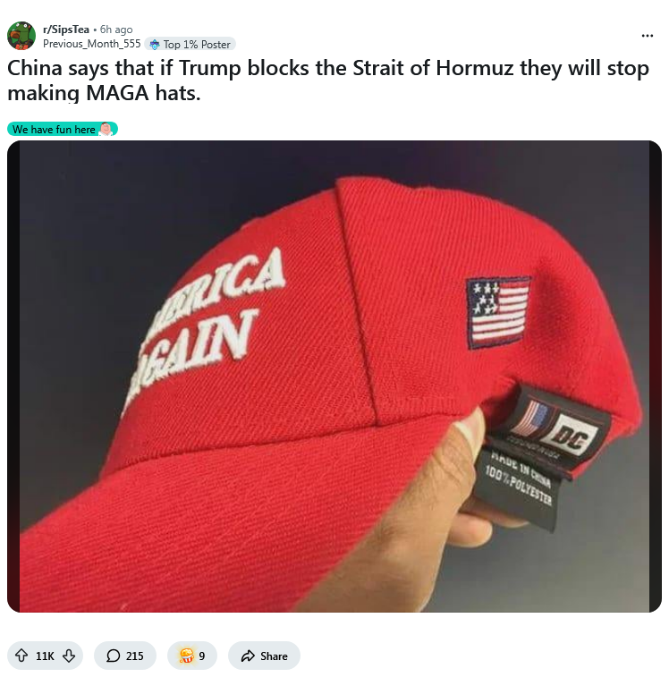 china makes our hats because we own them you fucking mudslime