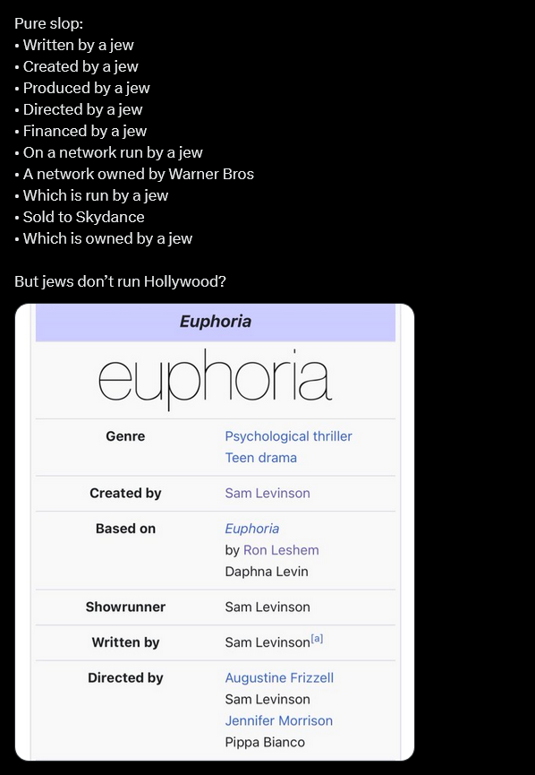 >>533479595Explains why Netflix movies are some of the worst Jewish programming. Here's one of their latest ones:https://en.wikipedia.org/wiki/Ladies_First_(2026_film)>DirectorLikely Jewish>ProducerJewish>ScreenplayJewish>Baron Cohengoes without saying