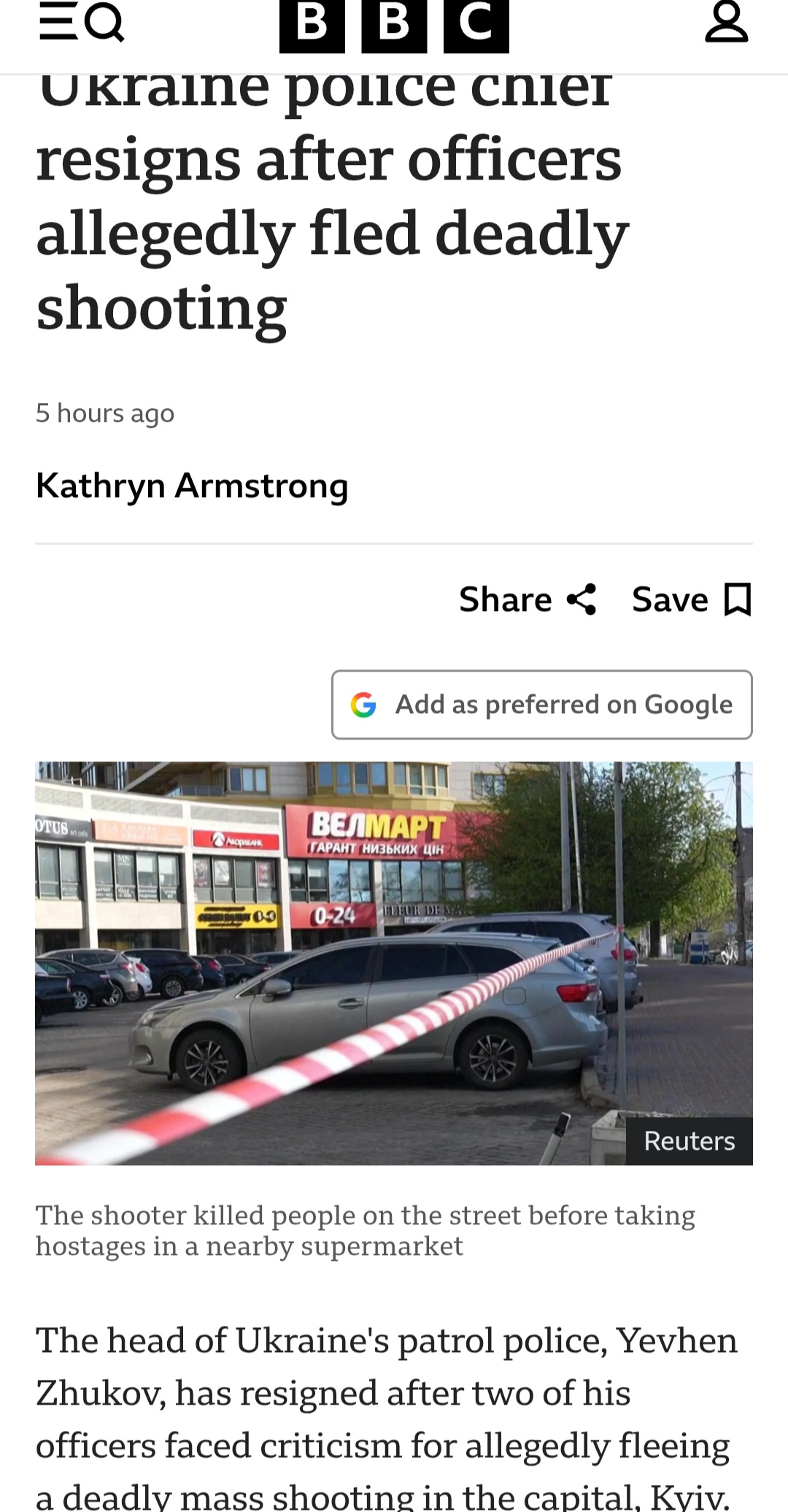 >The shooter killed people on the street before taking hostages in a nearby supermarket>The head of Ukraine's patrol police, Yevhen Zhukov, has resigned after two of his officers faced criticism for allegedly fleeing a deadly mass shooting in the capital, Kyiv.>Six people died and 14 others were injured on Saturday after a man opened fire on people in the street in Kyiv's southern Holosiivskyi district before taking others hostage in a nearby supermarket. He was later killed in a shoot-out with police.>Footage has since been shared online appearing to show officers leaving civilians and running away from the scene.>Ukraine's Interior Minister Igor Klymenko said the officers in question had been suspended and that an investigation into their actions was under way.>"'Serve and protect' is not just a slogan. It must be supported by appropriate professional actions. Especially at critical moments, when people's lives depend on it," he wrote on Telegram.are you okay, hyhyls?