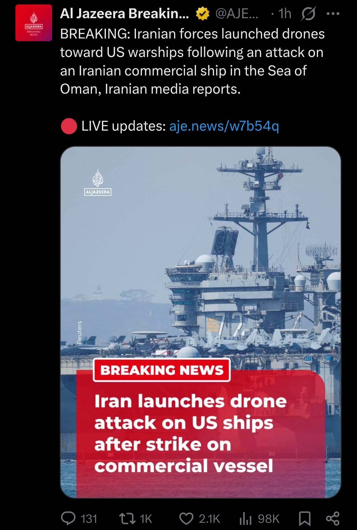 >Tasnim: Iran attacked US warships with drones.WAAAAAAAAAAAAAR