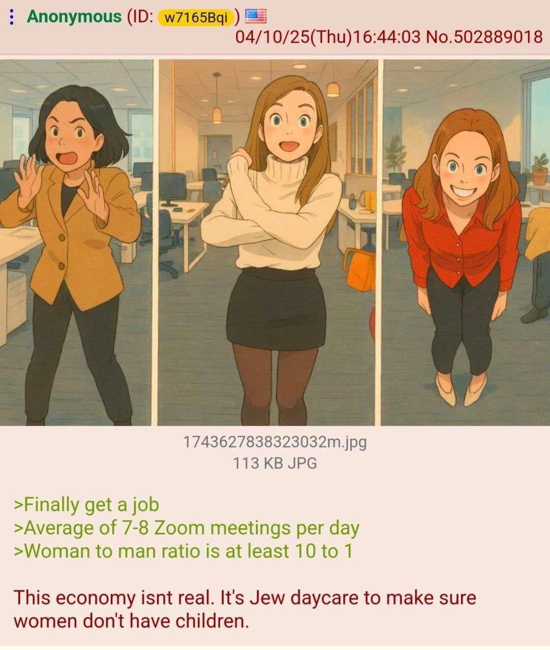 >>533474625>the owner is one of them and had a baby how is that a jew daycare job!>literally the marketing department doing what they’re supposed to!Kek, women experience psychosis one week out of every month. Them getting in a circle making a dumbass tiktok as “marketing” while men break their backs building the office and running the electricity. Talk about girl power! Stupid feminist whores kek