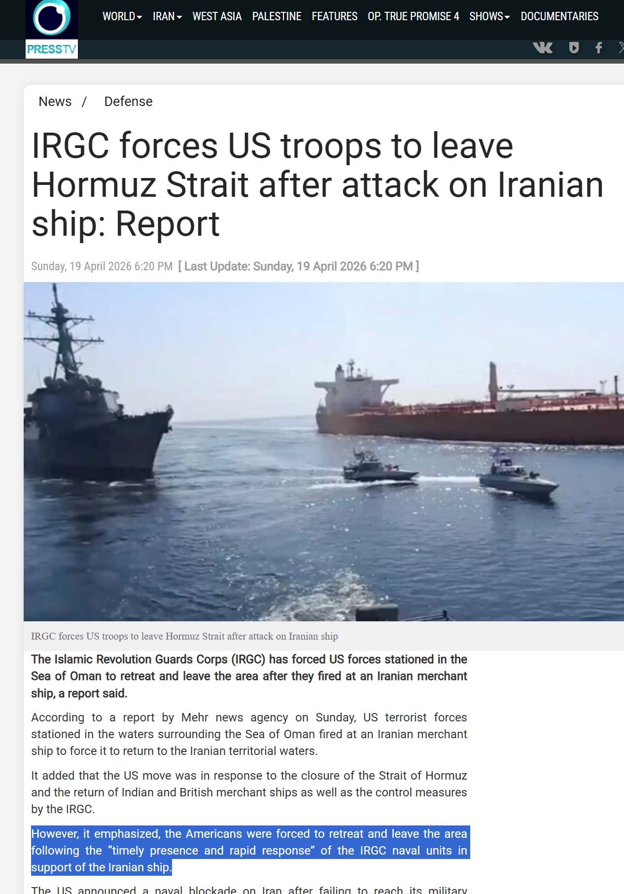 >>533486684both mehr news and presstv are state-affiliated and controlled agencies.https://www.presstv.ir/Detail/2026/04/19/767185/IRGC-forces-US-troops-to-leave-Hormuz-Strait-after-attack-on-Iranian-ship-Report