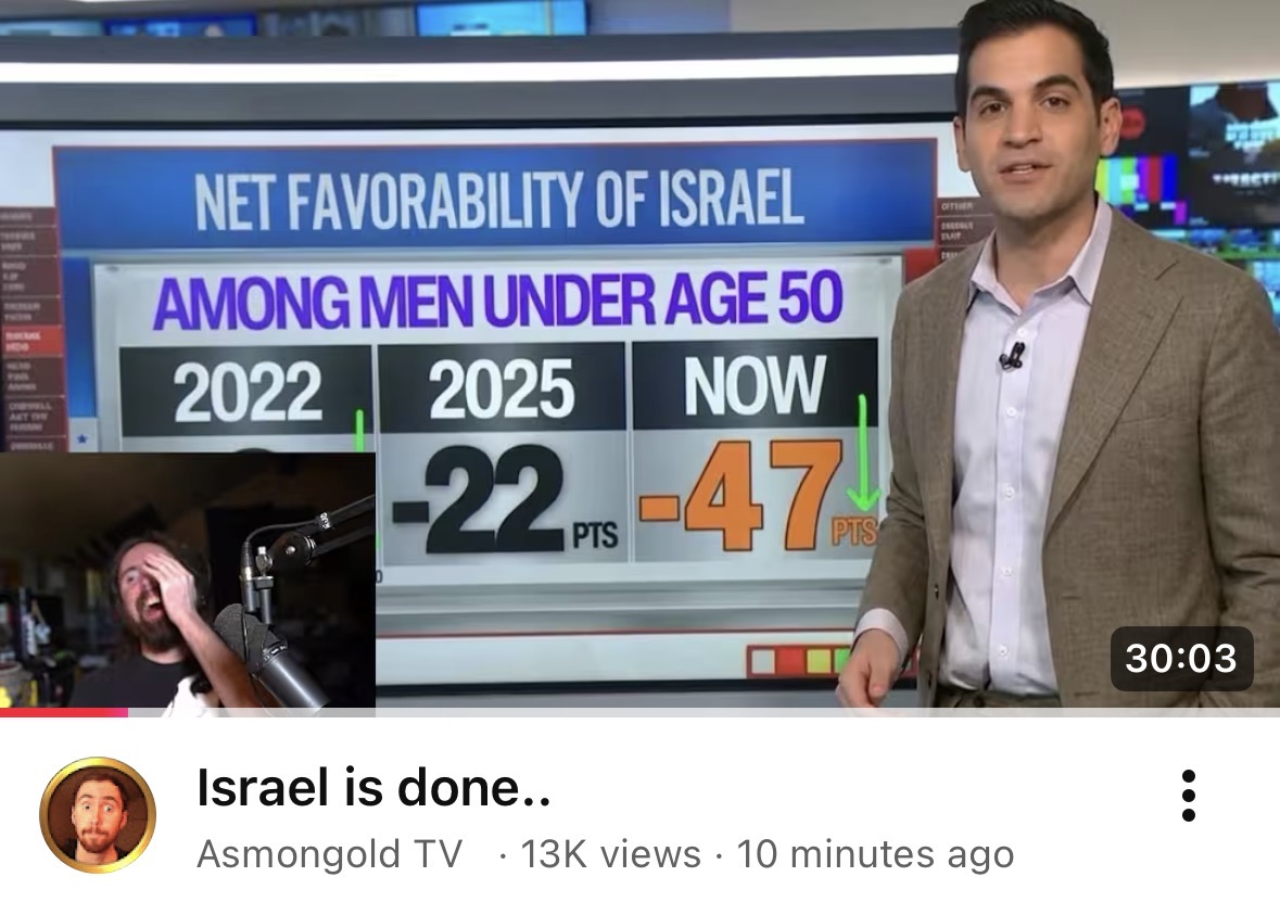 >>533483747Gee, why would the favorability of Israel to men under 50 even matter?