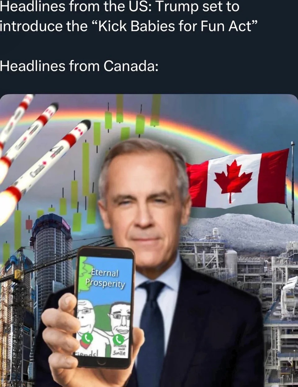 He says this as he himself is personally heavily invested in the U.S. 91% of his investments are in U.S. assets. He signed off on Brookfield Asset Management to move it's headquarters from Toronto to New York in 2024. He has an undergraduate degree from Harvard and post graduate degrees from the U.K. making him the first Canadian PM to not be educated in Canada. His wife is British and works in New York for the Eurasia Group and I think all his kids were born in the U.S. and go to U.S. schools. All this anti-American bluster is performative patriotism to cynically manipulate his base who eat it up like seals being thrown fish.