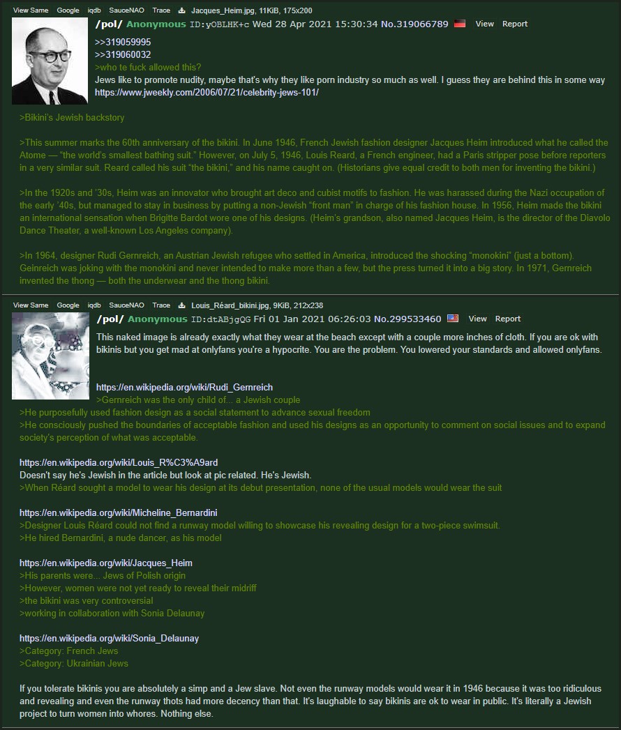 >>533493442>covering up female featuresislam is right about women? men did greater things whet it was actually hard to see boobs.inventor of the bikini, prolly a crypto jew by the looks of it.