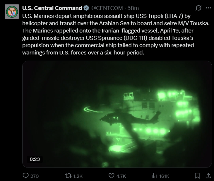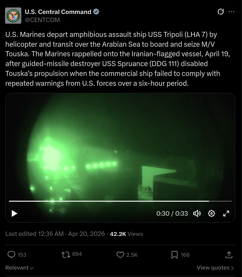 kinohttps://x.com/CENTCOM/status/2046085543348293851Wait, why did they shoot its engines if they were going to board it via helicopter anyway?