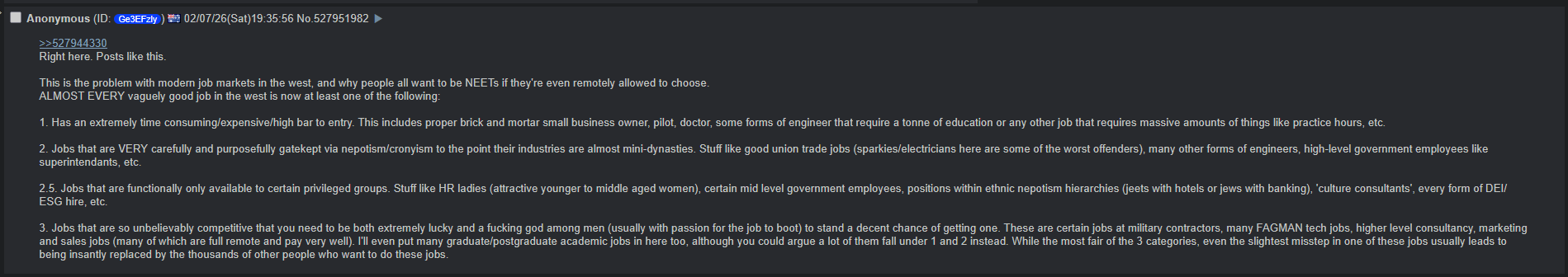 >>533508292I'll admit that post has a very different tone, and was trying to look at things on a wider scale compared to my thread today which is much more individual focused.The points in the pic still stand though. Most young people have no easy out as entrepreneurs, almost all jobs are applied for online and now those are being overrun and driven into the ground by people inevitably optimizing by having LLMs write 30+ applications an hour for days or even weeks on end. You can't fix societal issues only on the back of individual improvements- they might help individuals, but that is not a useful longer-term solution for young people in general. 'Just outcompete thousands of people bro' is abjectly psychotic, especially considering said thousands of people will immediately replace you if you disagree with your boss on literally anything.