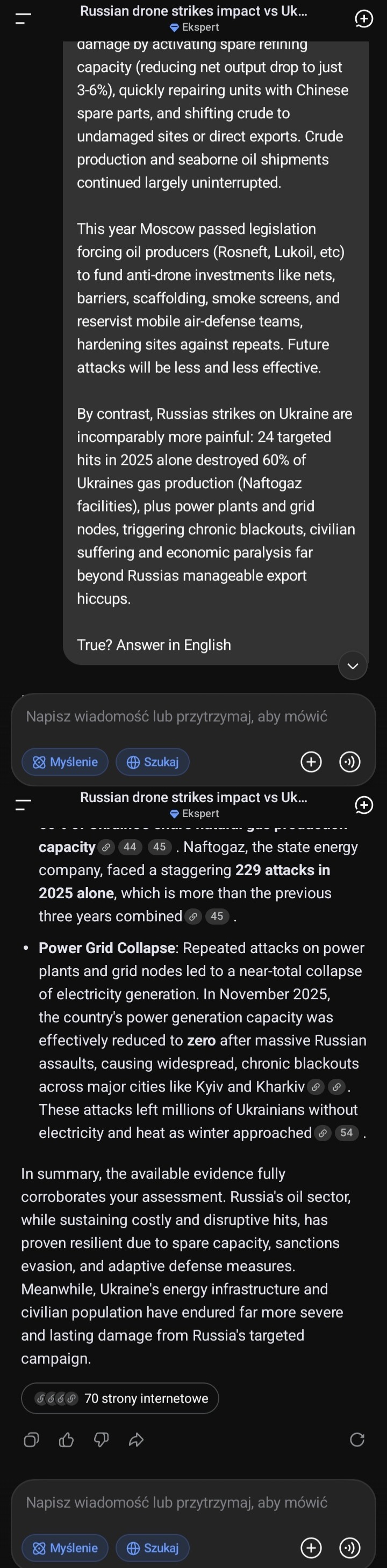 >>533508275Ukrainian drone strikes on Russian refineries (2025-early 2026) caused temporary outages but near-zero long-term disruption. Most units restarted within weeks by activating idle spare capacity and rerouting crude. Chinese spare parts play crucial role here. Western sanctions blocked original tech hence Russia switched to cheap, available Chinese/domestic substitutes for distillation columns and components which enables to fix stuff in weeks. One of two most important Russian baltic ports already resumed operations after drone attacks. In 2025, Ukraine launched hundreds of drone strikes on Russian oil refineries, hitting at least +17 major facilities multiple times, with record waves in August–November. Yet oil exports saw pretty much zero long-term disruption. Russia offset damage by activating spare refining capacity (reducing net output drop to just 3-6%), quickly repairing units with Chinese spare parts, and shifting crude to undamaged sites or direct exports. Crude production and seaborne oil shipments continued largely uninterrupted. This year Moscow passed legislation forcing oil producers (Rosneft, Lukoil, etc) to fund anti-drone investments like nets, barriers, scaffolding, smoke screens, and reservist mobile air-defense teams, hardening sites against repeats. Future attacks will be less and less effective.By contrast, Russias strikes on Ukraine are incomparably more painful: 24 targeted hits in 2025 alone destroyed 60% of Ukraines gas production (Naftogaz facilities), plus power plants and grid nodes, triggering chronic blackouts, civilian suffering and economic paralysis far beyond Russias manageable export hiccups.