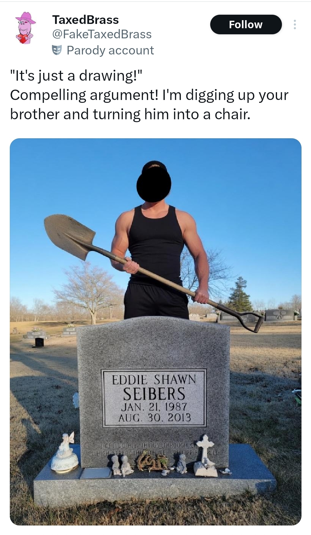 >>533505030Basically some anti lolicon lolbert youtuber made a tweet in response to a lolicon youtuber who basically said drawing aren’t real people and the lolbert responded with an ai image of them holding a shovel outside his brothers who killed themselves grave