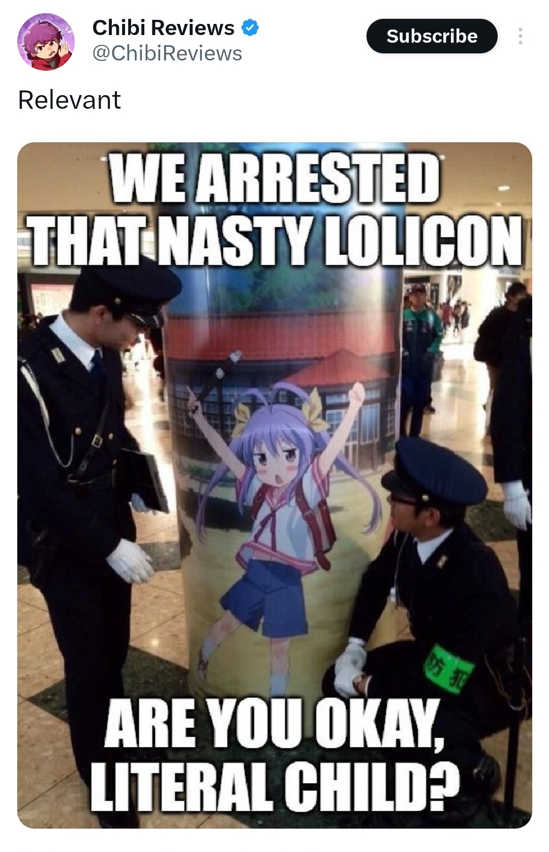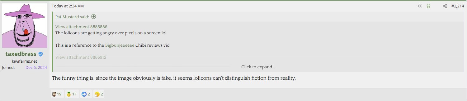 > real adult woman that looks 12? Perfectly legal> cartoon that looks young-ish? I’m going to fucking kill youWhat am I missing about the NPC moralizing over this shit? Yeah, it’s weird. It’s no weirder than a whole bunch of things that are perfectly legal and nobody wants to make illegal.