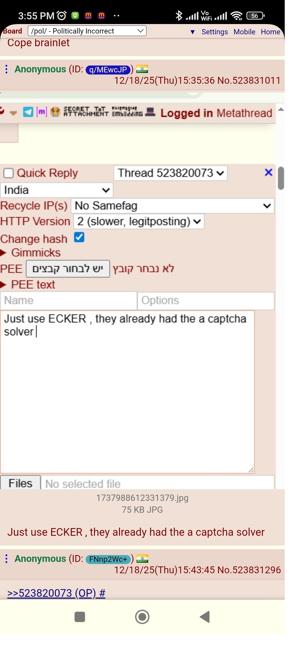 >>533505397doesn't work it's some kind of hardware fingerpringing technique or something.>>533505422>Call 4chan tech support and ask for SanjayI threatened to cancel my 4chan account but then I realized I was actually just schizophrenic and was talking into a fisher price toy phone with googly eyes.Sanjay was nice though