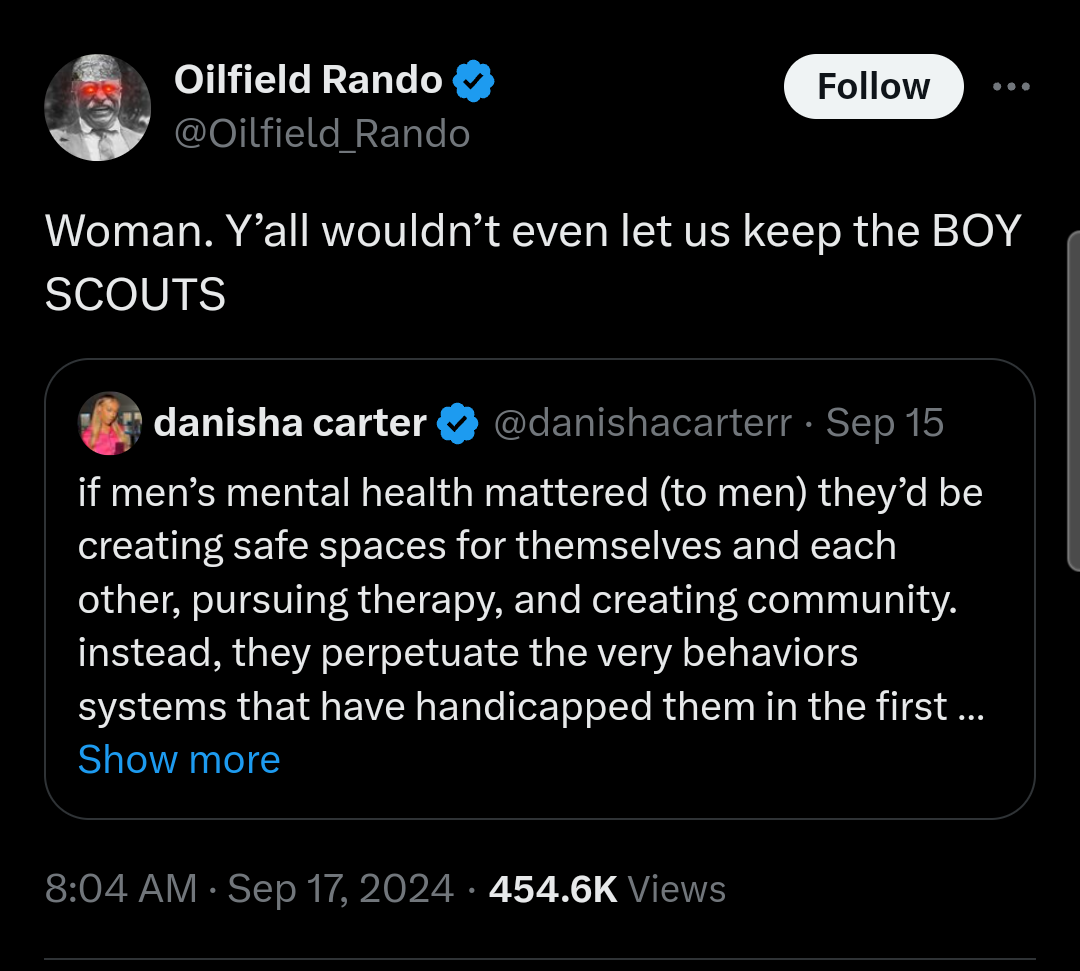 >>533506543>”THERES NO MALE LONELINESS EPIDEMIC, MEN JUST DONT SUPPORT MEN!”>Men make a space for me >Immediately dogpiled by every feminist org and pilloried in the media I’m tired, boss